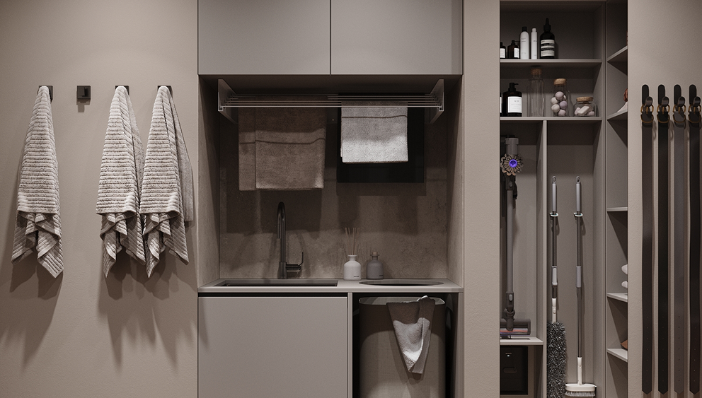 This Creekside project blends Japandi influences with modern living. The design highlights natural textures such as parquet floors imported from Sweden, authentic travertine, and marble sinks. All these are combined with wood, stone, and light to create a calm and elegant atmosphere. Every element was carefully selected: Italian sanitaryware and furniture, British sockets, and custom non-standard doors made to order. The apartment feels unique, with details gathered worldwide to achieve a refined yet functional space.